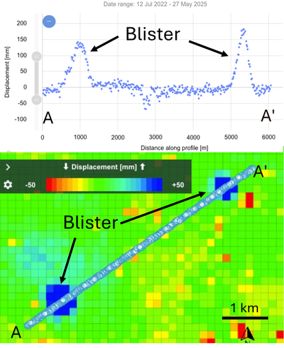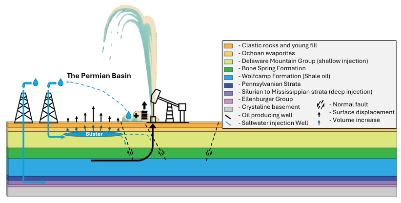 Saltwater disposal increases subsurface pore pressure, especially around the injection wellbores. However, this pressure can move and find weak spots like old, compromised wellbores miles away. Over time, this can lead to the formation of blisters, localized zones of rapid uplift, which are often invisible through conventional monitoring.