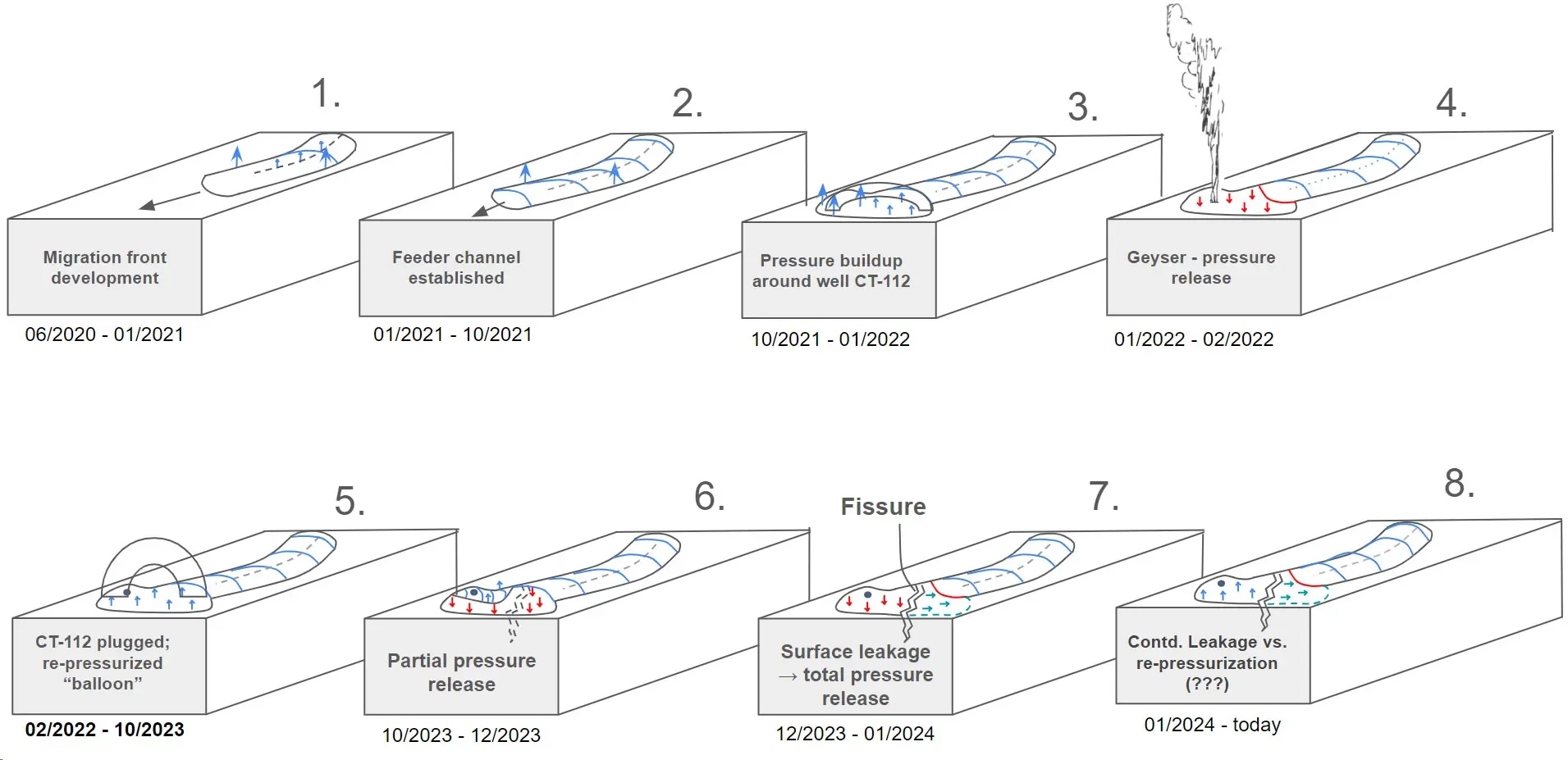 In the images below, we can see the actual geyser and the historical progression demonstrating the wide area impact of water injection and how it led to this eruption.